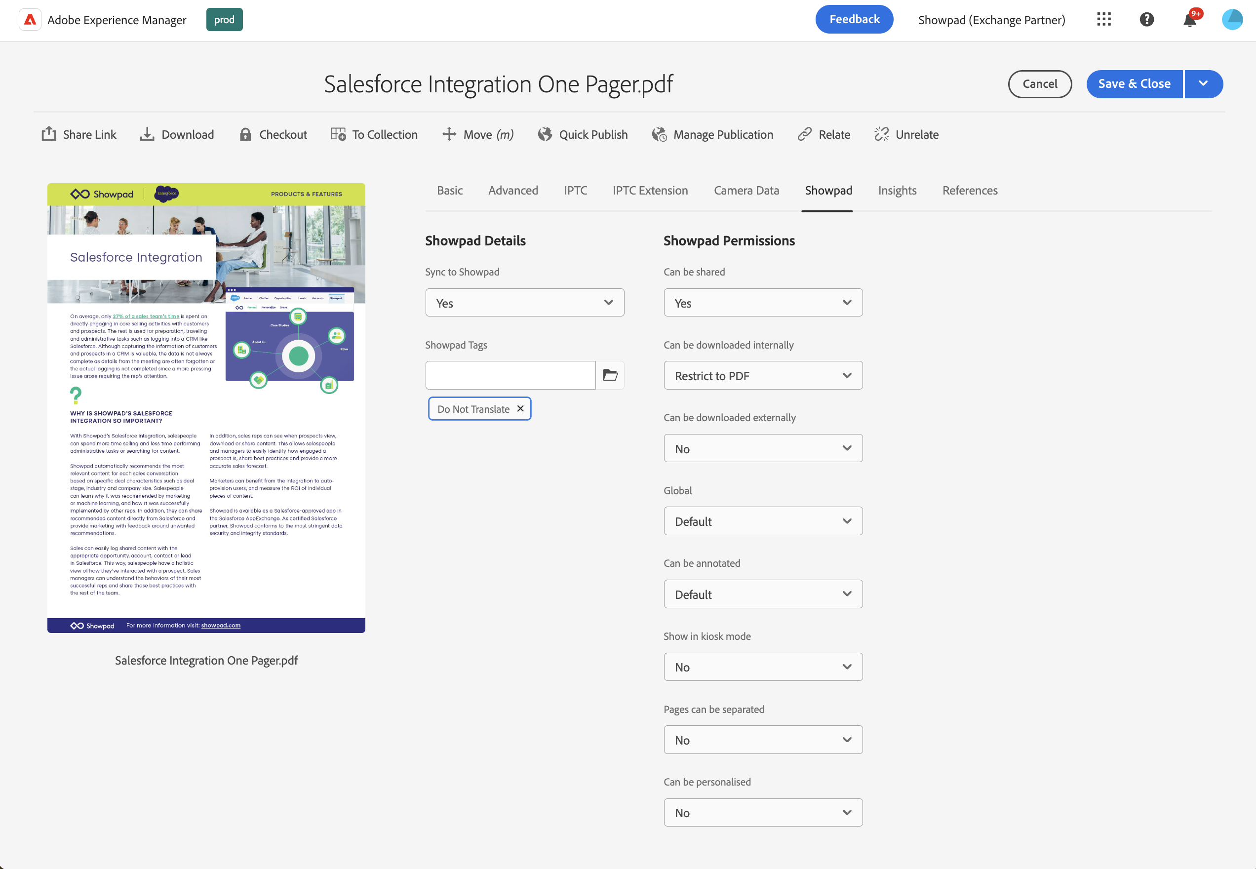 - Keep Adobe Experience Manager as a single source of truth while instantly sharing new and updated content with sales through Showpad
