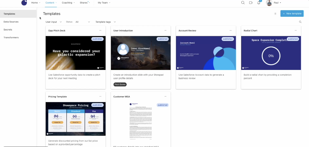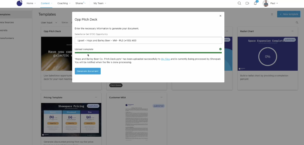 Revolutionize your custom presentations and documents with Showpad's Automated Content Builder. Our very own app effortlessly integrates prospect or customer data into a master template, allowing marketing teams to steer the narrative and visual identity. By designating customizable elements within the templates, we empower selling teams to infuse the presentation with personalized elements drawing from your CRM, customer health platforms, or any API-enabled source. The balance of control and creativity ensures brand consistency while enabling your teams to have tailored and impactful conversations.