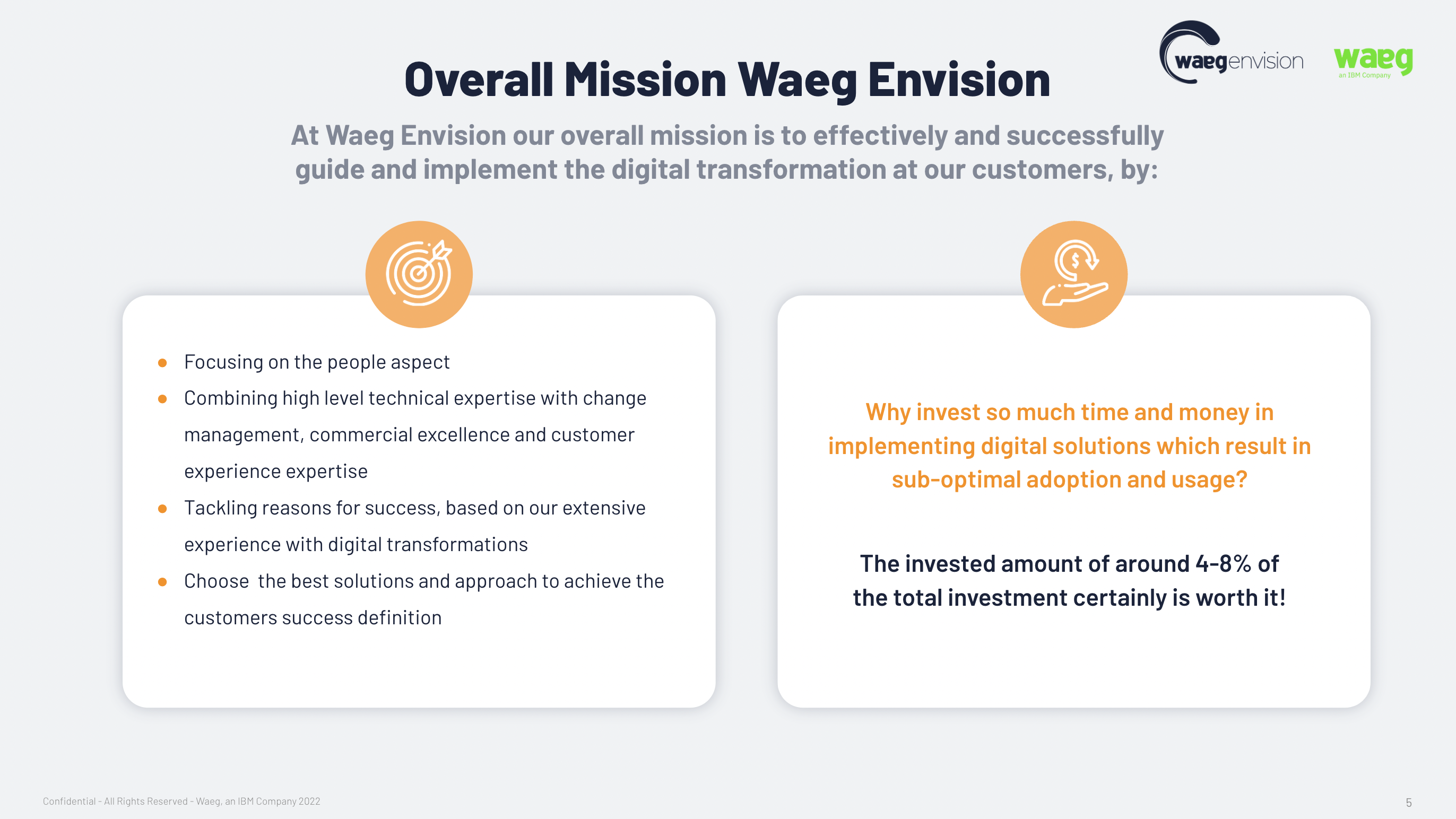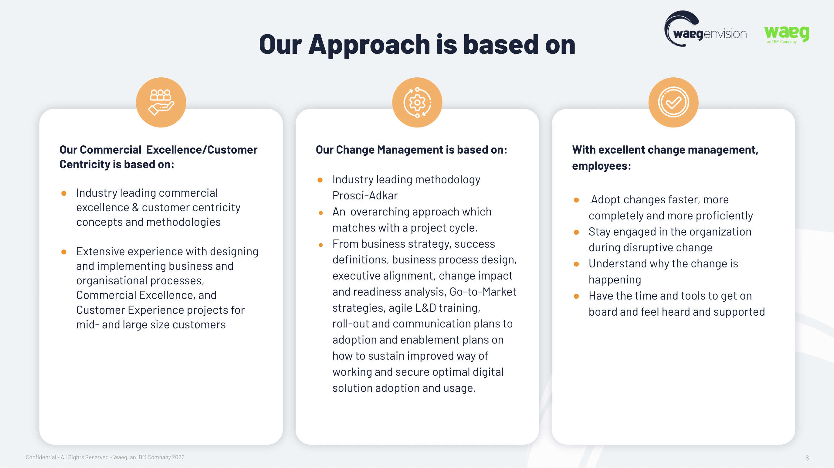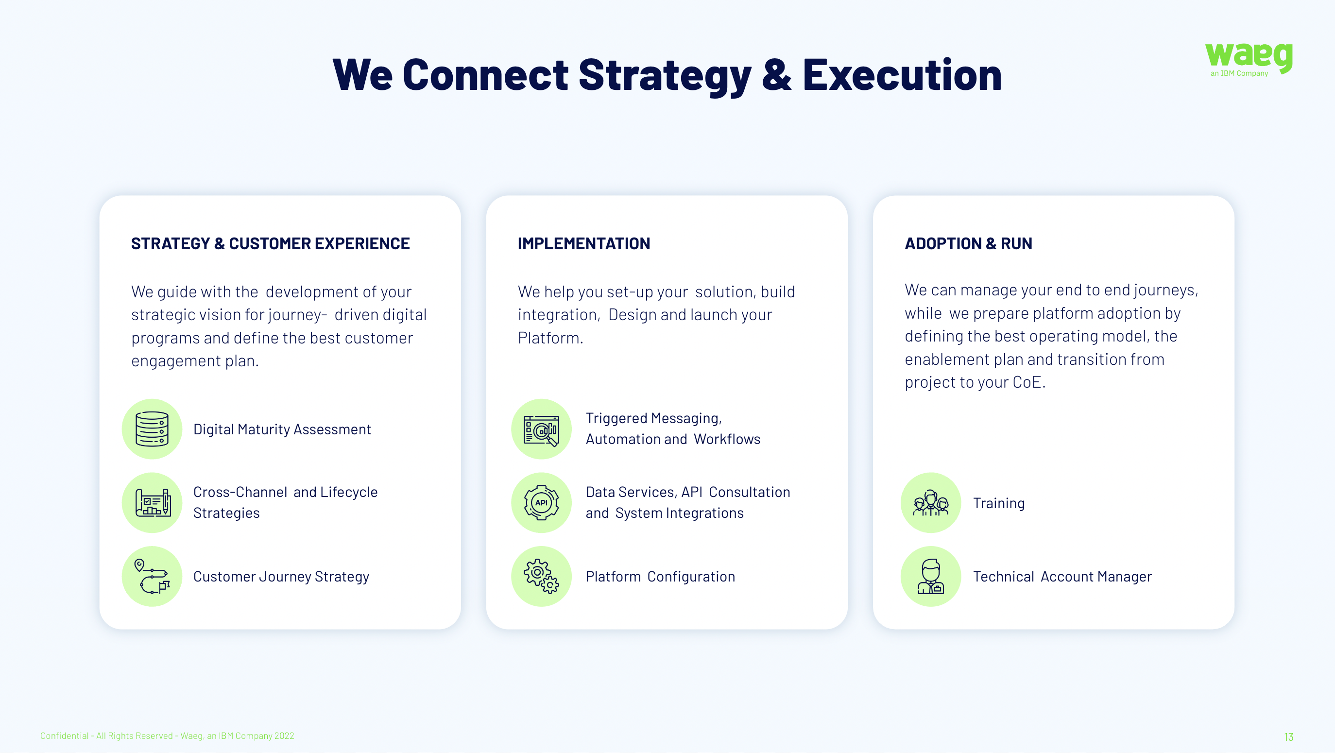 At Waeg, an IBM Company we take our experience and expertise and create tailor-made strategies for our clients. Using 𝐂𝐨𝐦𝐦𝐞𝐫𝐜𝐢𝐚𝐥 𝐄𝐱𝐜𝐞𝐥𝐥𝐞𝐧𝐜𝐞, 𝐂𝐮𝐬𝐭𝐨𝐦𝐞𝐫 𝐄𝐱𝐩𝐞𝐫𝐢𝐞𝐧𝐜𝐞, and 𝐂𝐡𝐚𝐧𝐠𝐞 𝐌𝐚𝐧𝐚𝐠𝐞𝐦𝐞𝐧𝐭 best practices, concepts, and methodologies we help our clients by creating unique paths, specifically adjusted to each need, that will lead to a successful digital transformation journey.